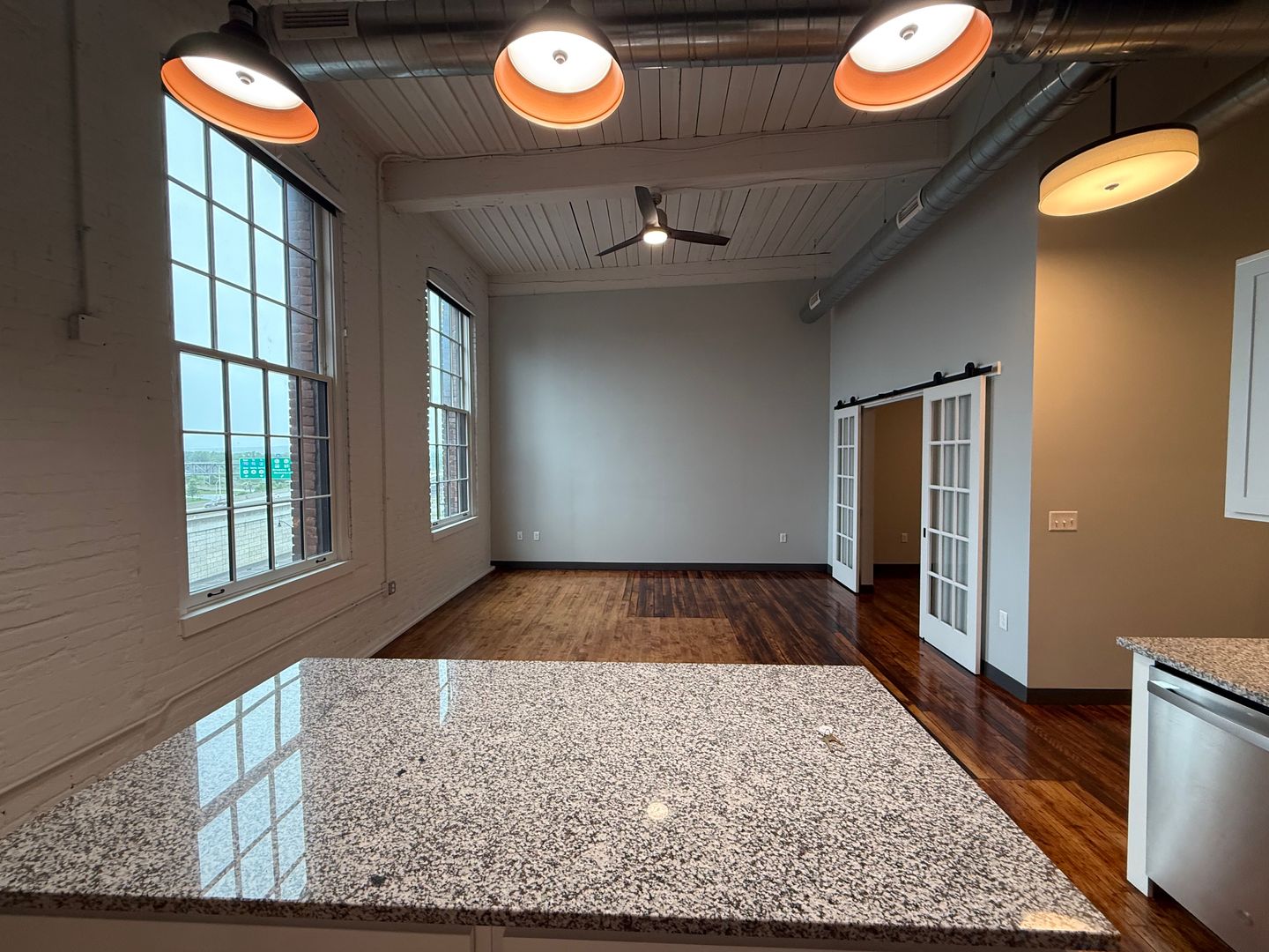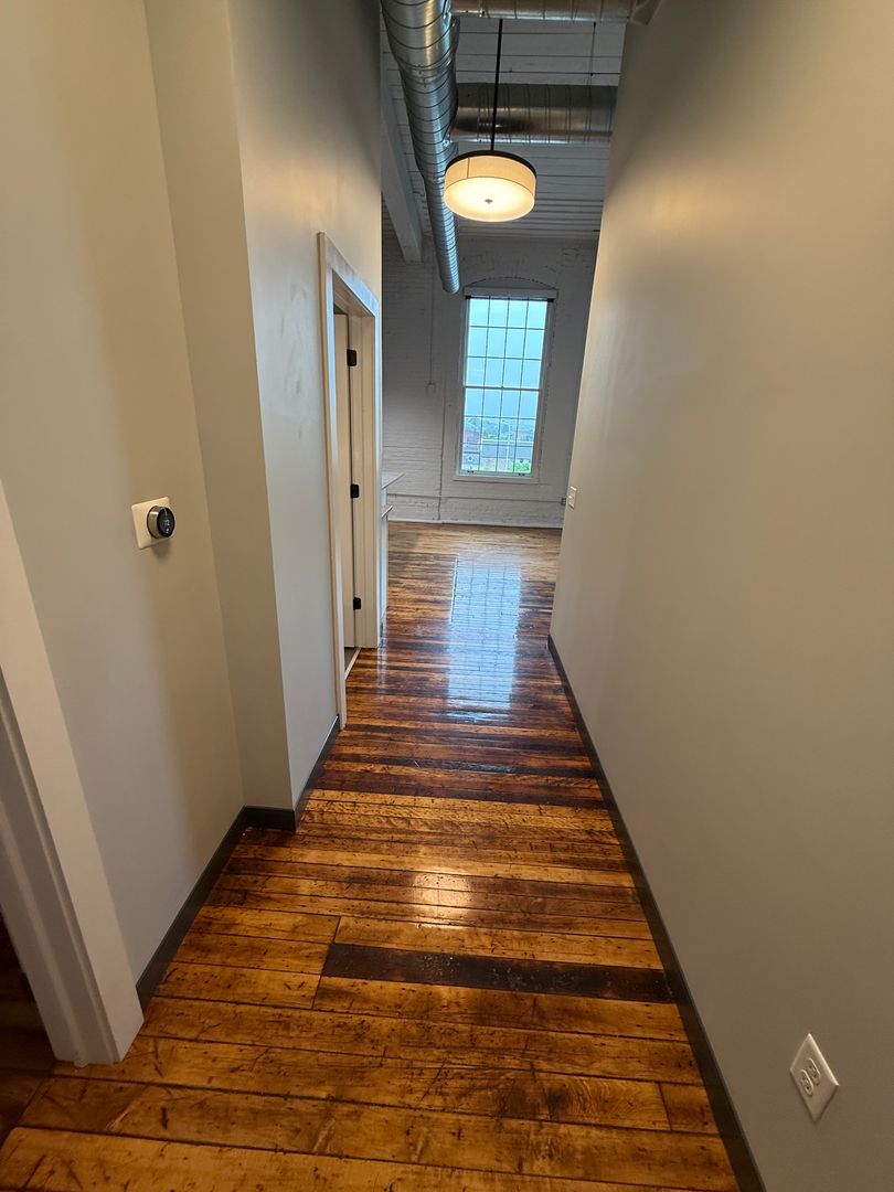 Exposed Brick, wood beams, refurbished hardwood floors